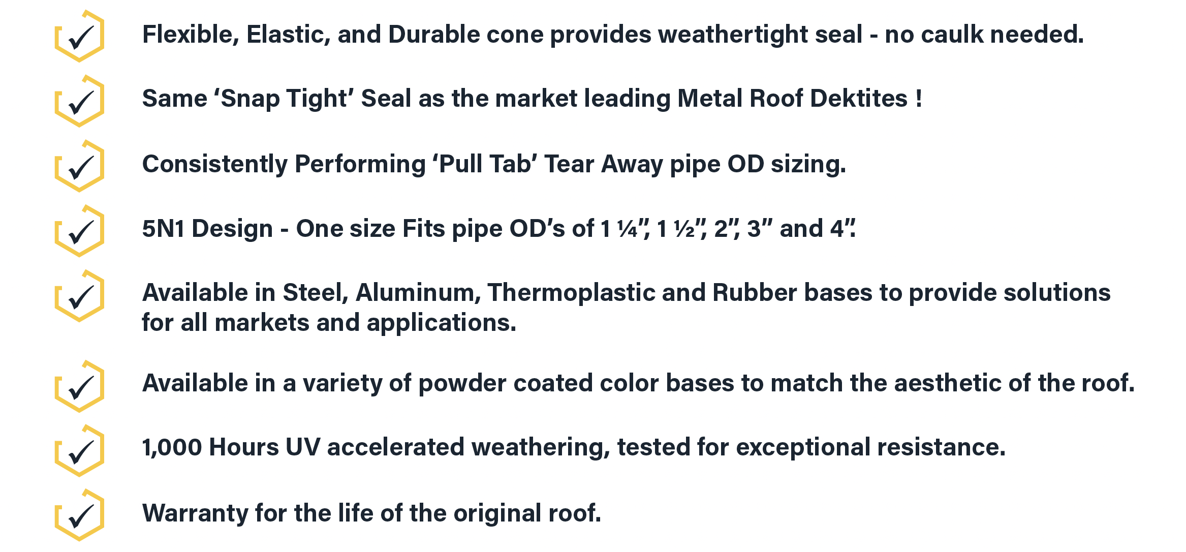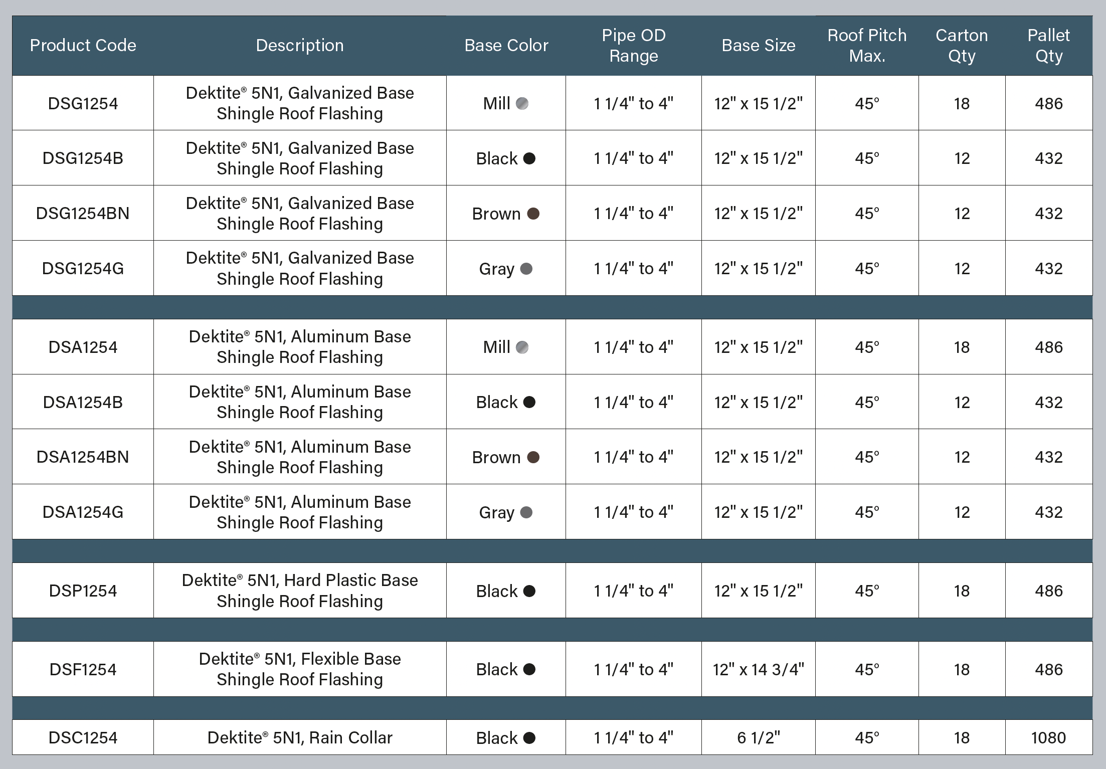 Choose from a Dektite 5N1 for a quick watertight solution for pipe OD sizes of 1 ¼” to 4”, or Dektite SHR for Electrical Service Masts when reroofing.